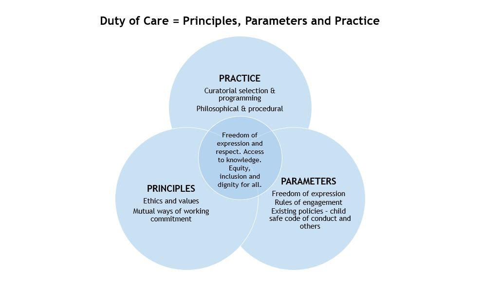 The Ways of Working Commitment is informed by these core values and sits within a framework of Principles, Parameters and Practice. This framework is built around the central tenets of freedom of expression and respect, access to knowledge and equity inclusion and dignity for all.